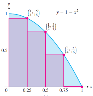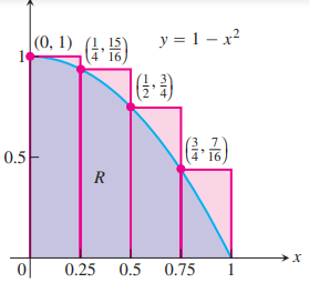 We can estimate the area R under a function f by using rectangles. The number of intervals (the more the better) and the height of the rectangles determine the accuracy of our estimate. There are three general ways to estimate the area using different heights for the rectangles.