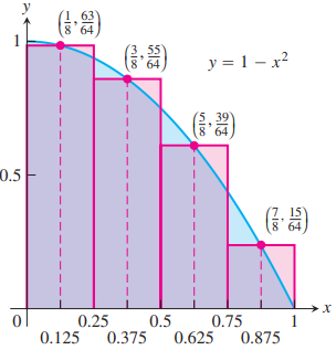 The above illustrates the upper sum, this estimate is larger than the true area A since the rectangles contain R. It is obtained by taking the height of each rectangle as the maximum (uppermost) value of ƒ(x) for a point x in the base interval of the rectangle.