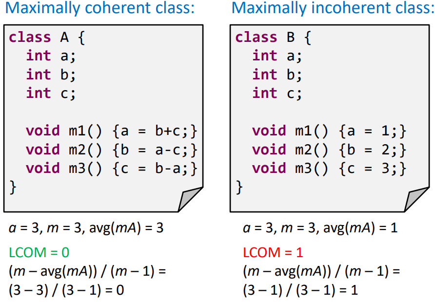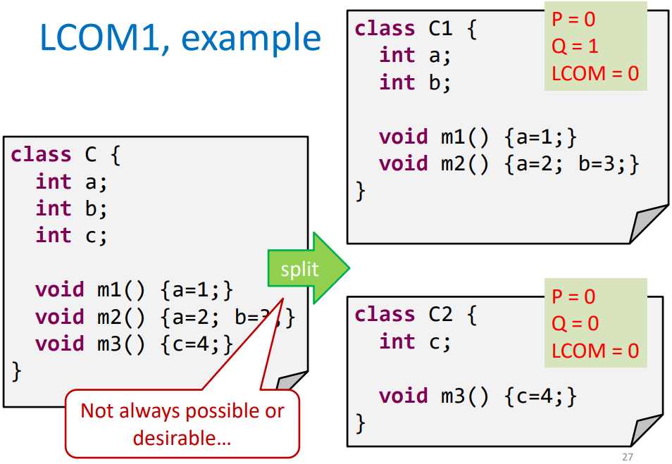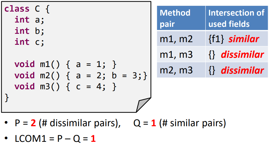 LCOM is equal to the surplus of dissimilar pairs. There are two ways LCOM can be calculated, LCOM1 and LCOM2. Let’s quickly look at LCOM1: P = number of dissimilar methods pairs Q = number of similar method pairs So that: