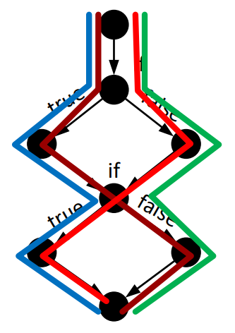 When testing it’s important to know how many possible execution paths there are, these are possible ways to go through leading to different outcomes. The amount of possible execution paths is equal to the amount of required rest cases, see illustration below in which each colored line is a different execution path.