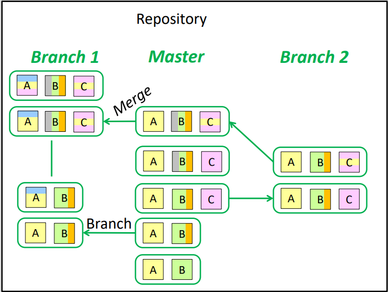 Branching means you diverge from the main line of development and continue to do work without messing with the main line. This separate line of development can be combined (merged) with the other lines of development. The working copy on a local computer can easily switch between branches. The main branch is normally called master.