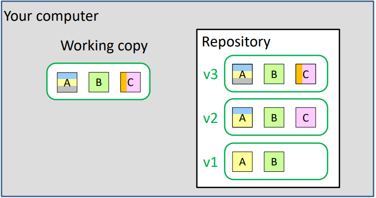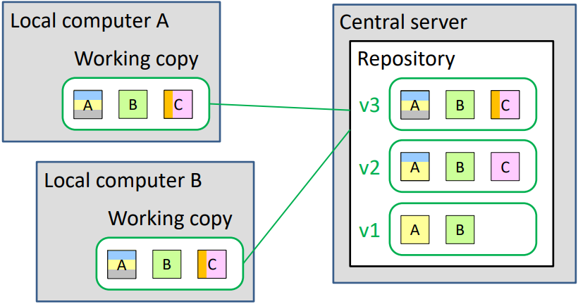 This method stores versions of your files in a repository (folder), while the latest version of the version you’re currently working on (working copy) is separately stored on your computer.