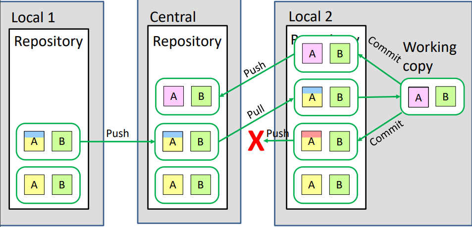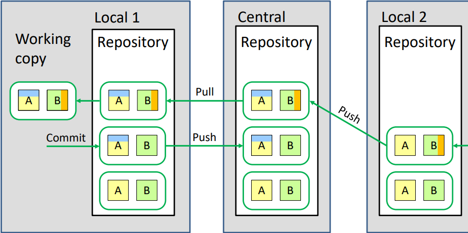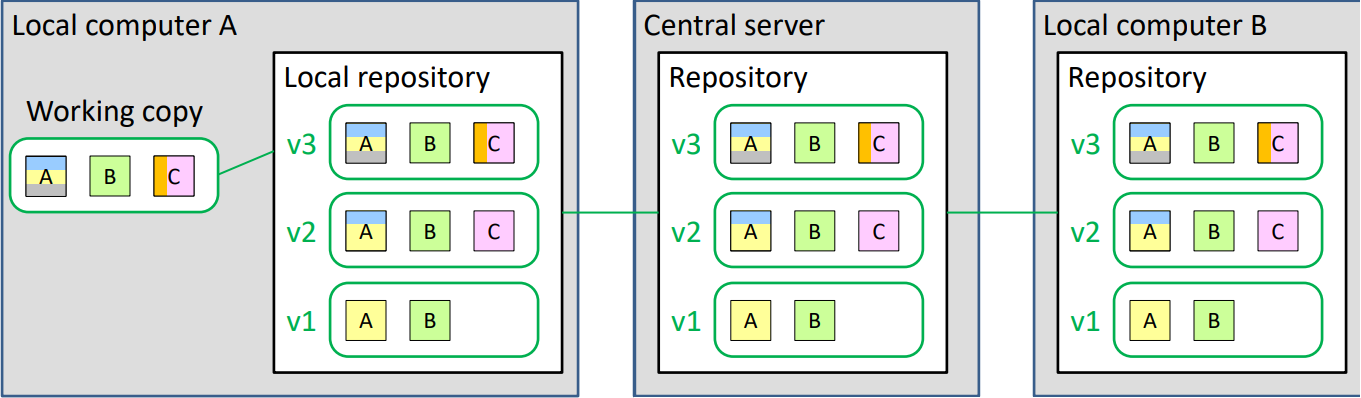 Just like in central version control this method also has a central server containing a central repository. But this same repository is also copied onto the local computers, meaning everyone is continually cloning (copying) this central repository to their computers. The local computers still have a working copy which can be stored (committed) to the local repository which in turn can be saved to the central repository. An example of distributed version control is git.