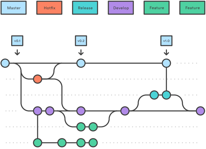 Conventions are that releases are kept on main (testing of releases is done on release), Hotfixes are sprung off from master and merged where necessary. New parts of releases are worked on in the develop branch while new features for the develop branch are done in their own separate branches.